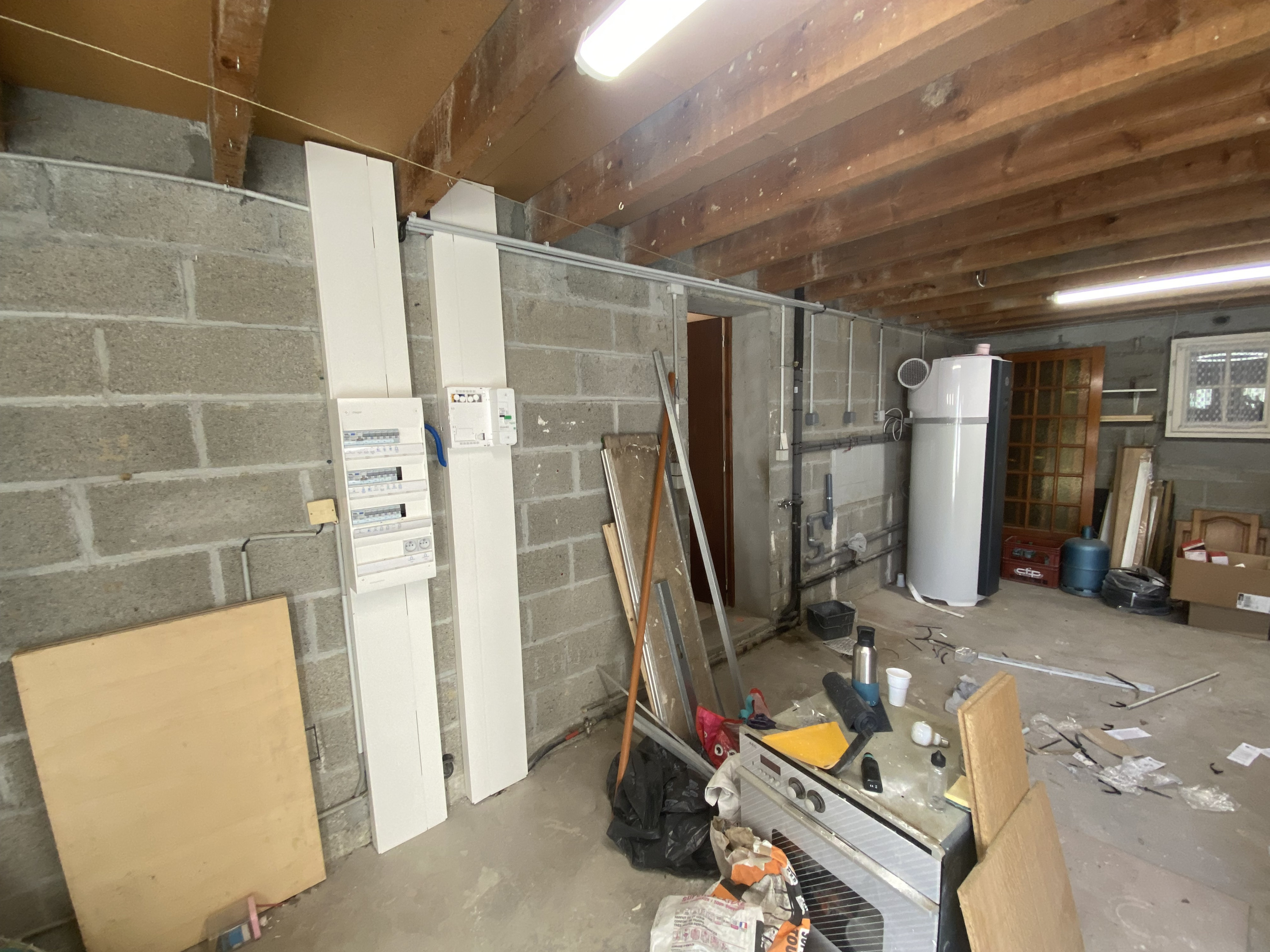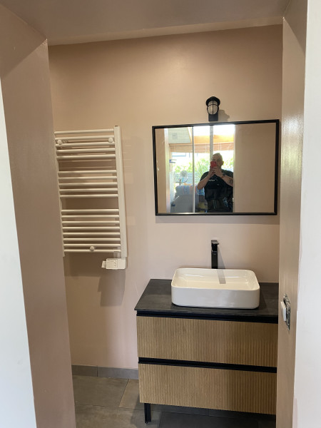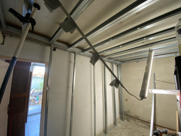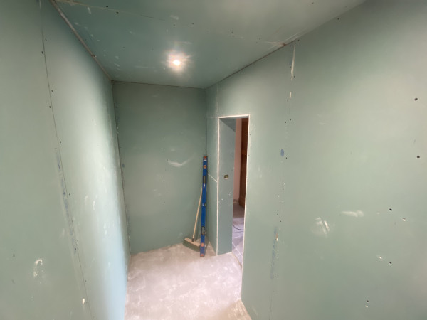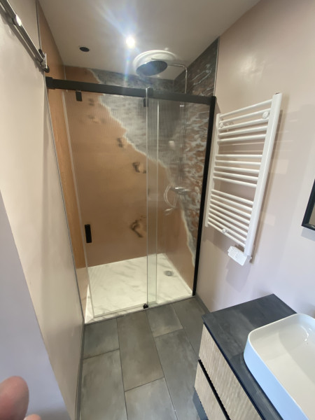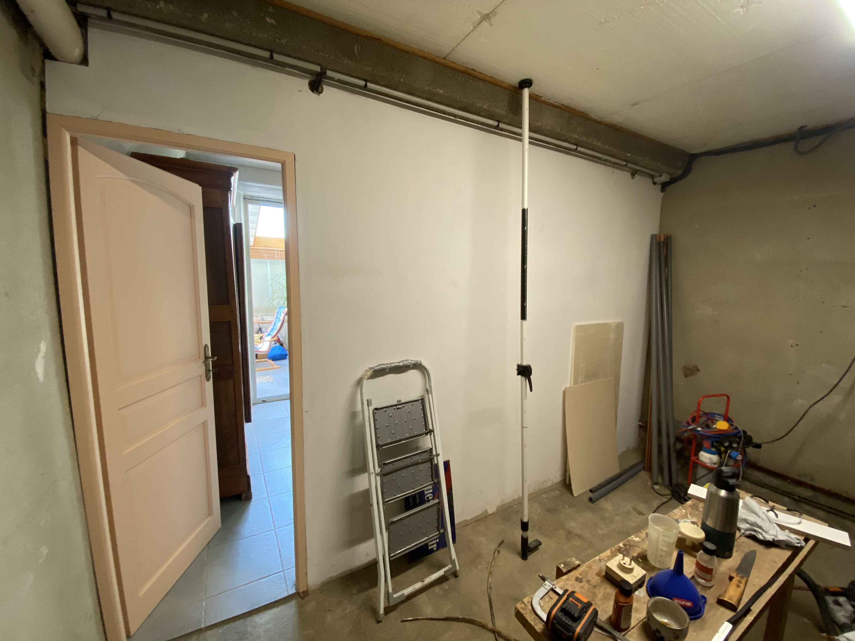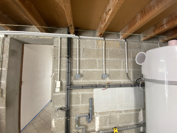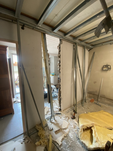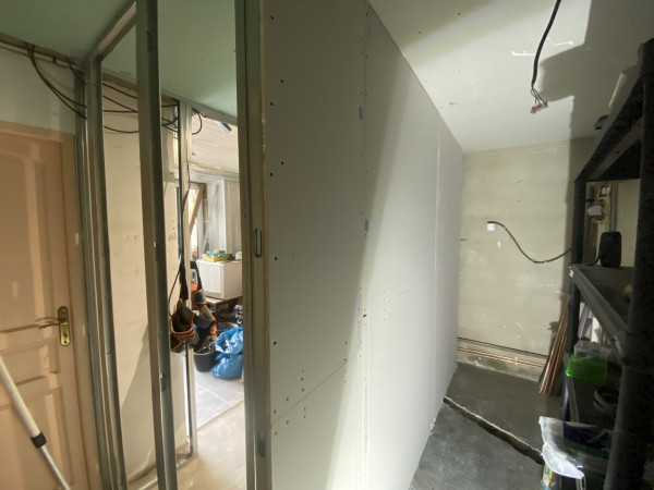 Conception et réalisation intégrale d’un espace douche au sein d’une arrière-cuisine, incluant l’aménagement d’une ouverture vers une future chambre, la mise en place du réseau d’évacuation et l’installation des arrivées d’eau.